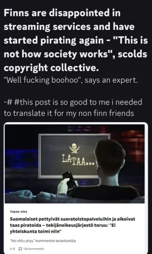 lanigerous@feddit.uk to Piracy: ꜱᴀɪʟ ᴛʜᴇ ʜɪɢʜ ꜱᴇᴀꜱ@lemmy.dbzer0.comEnglish · edit-23 days agoGood old Finland (subtitle is commentary, not in text)lemmy.blahaj.zoneimagemessage-square32linkfedilinkarrow-up1471arrow-down16file-text