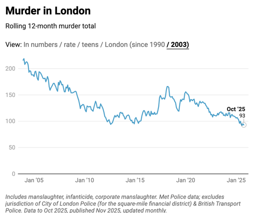 dwouu@lemmy.world to Mildly Interesting@lemmy.world · edit-26 days ago93 murders in London (pop: ~9million) in 12 months. London's murder rate is now at the lowest level for decadesplus-squarelemmy.worldimagemessage-square8linkfedilinkarrow-up1202arrow-down17